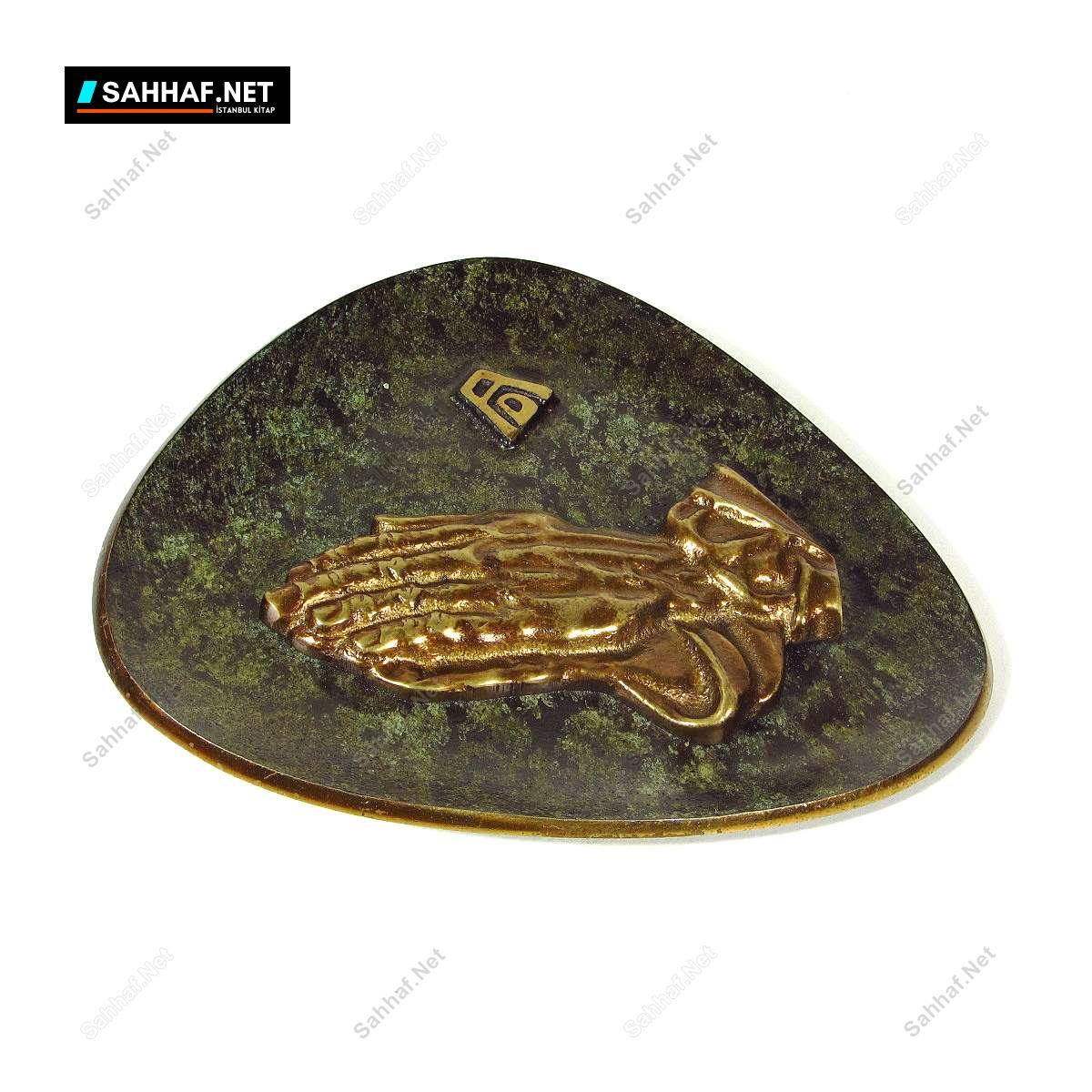Üzerinde bir çift el kabartması olan güzel bir duvar süsü, pirinç malzemeden yapılmış ve oldukça sıradışı bir boya tekniğiyle boyanmış. Önü ve arkası da boyalıdır, kenarları ve el figürü çıplak metal olarak bırakılmıştır. Üzerinde AD harfleri de var, ne anlama geldiği konusunda bilgim yok. El figüdü de sanırım dinsel bir figür niteliği taşıyor bildiğim kadarıyla fakat detay bilgisine sahip değilim. Oldukça kalın ve ağırca bir ürün. Arkasında şık bir asma halkasına da sahip, oldukça özenli yapılmış bir çalışmadır.Yükseklik: 10 cm