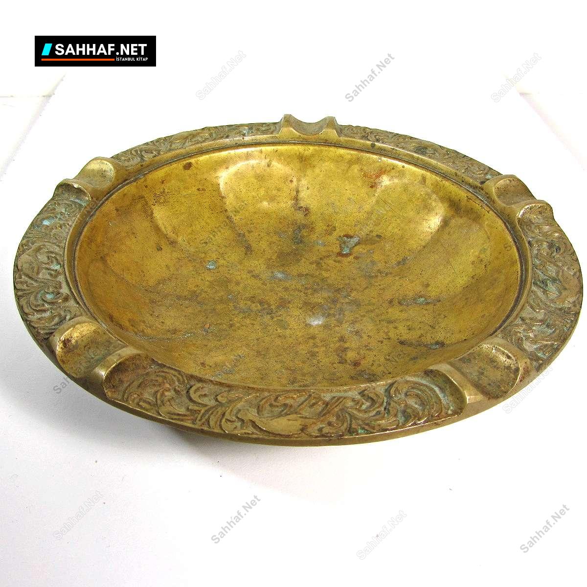 Tabak şeklinde eski pirnç küllük. Büyükçe bir küllük, 5 sigara koyma standı var. Eskiler fosur fosur içiyormuş, onu gösteriyor. Çap: 20 cm