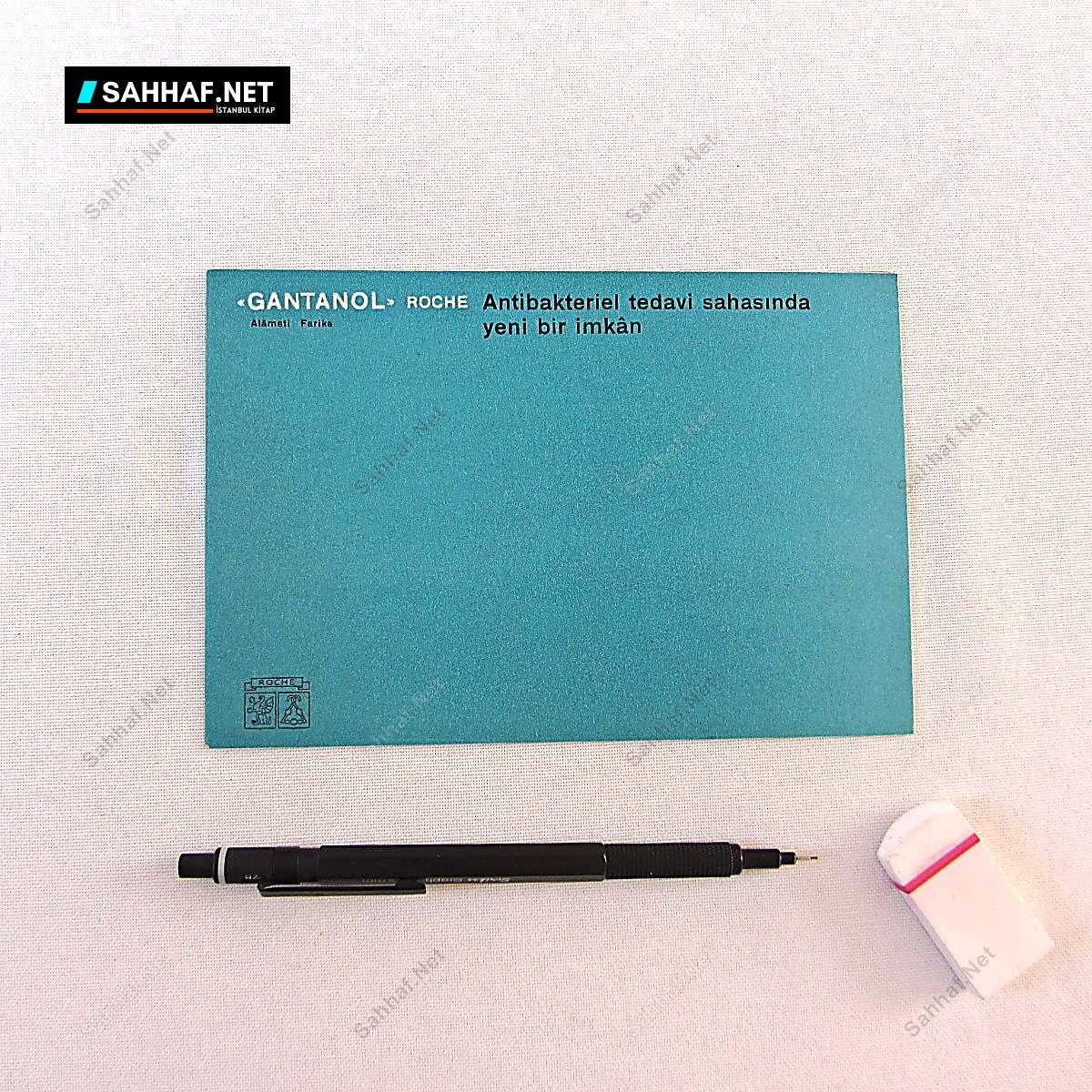 Roche ilaç firması GANTANOL ilaç tanıtım broşürü. Açılır 2 yapraklı, karton, üzerinde 1 kuruş belediye pulu ve 1 kuruş damga pulu vardır. 1950 veya 60’lar.