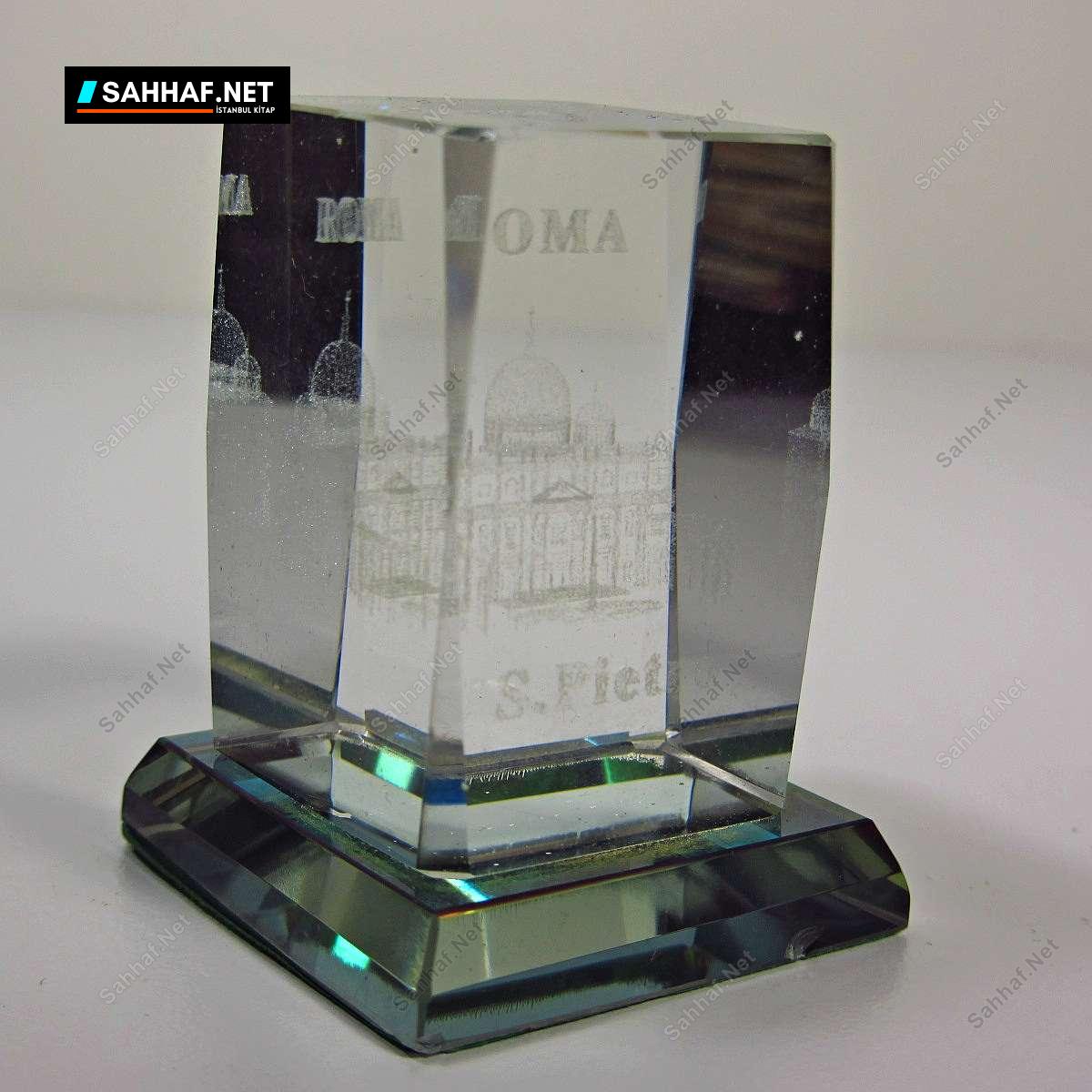 Roma hatırası kristal malzemeden, içinde 3 boyutlu S.Pietro Katedrali işlenmiş harika bir dekor. Saf kristalden yapılmış olmasının yanı sıra, yansıtıcı kullanılarak farkılı ışık kırılmaları yaratması sağlanmış, böylece elde çevirdikçe pembe, yeşil, mavi, kırmızı, kahverengi renklere bürünüyor. Alt kaidesinde belli olmayan 1 mm’lik çok minik bir atık var. Yükseklik: 5,5 cm