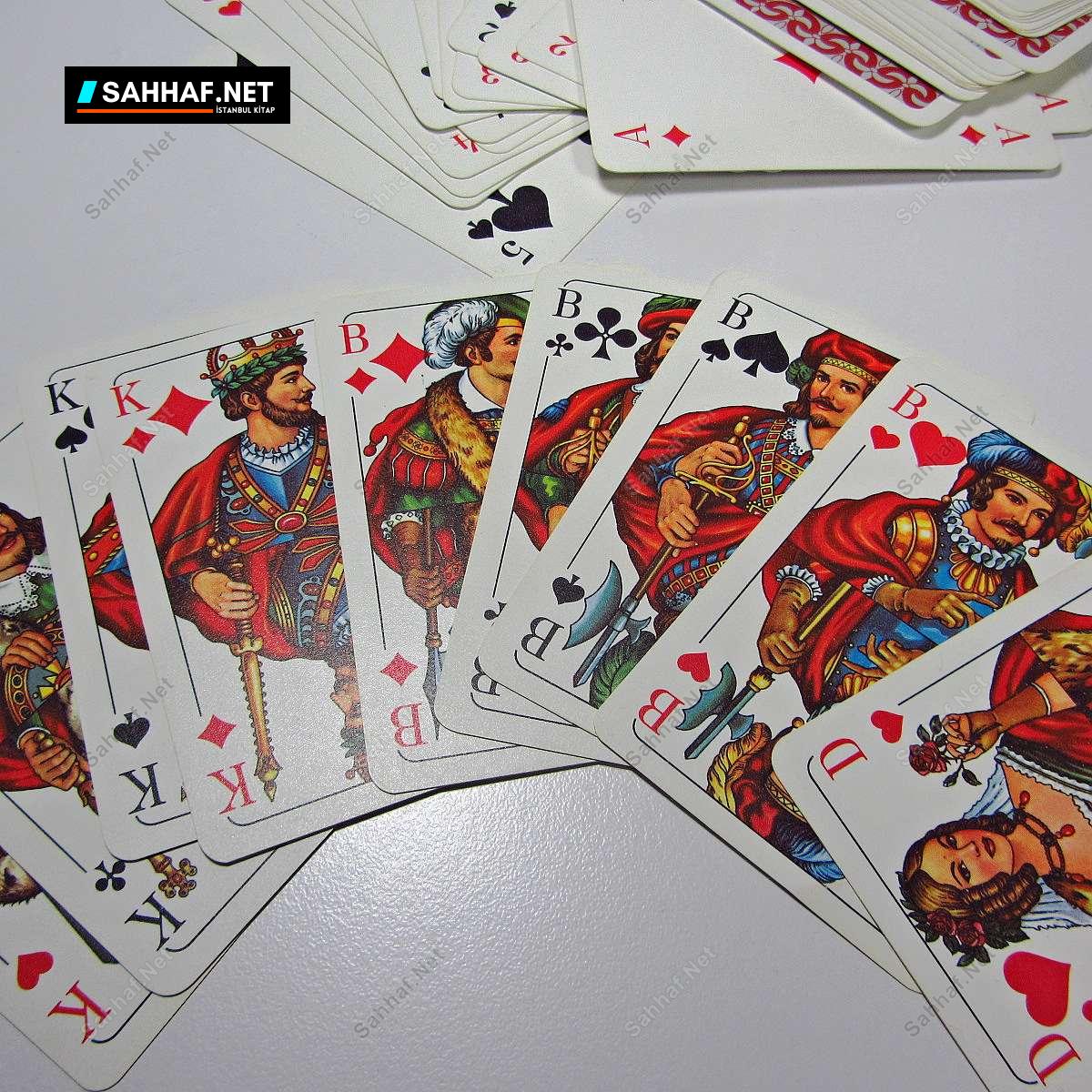 Royal Plastik 52 adet +3 Joker oyun kağıdı. Kartlar oldukça kaliteli ve belki de hiç oynanmamış kadar temizdir. Valeler V yerine B harfi ile basılmış; bunun bir anlamı var mı veya belli bir ülkeye has mı bilmiyorum. İkili deste kendi plastik kutusunda, kutu ikili takım için yapılmış, yalnızca 1 takımdır.