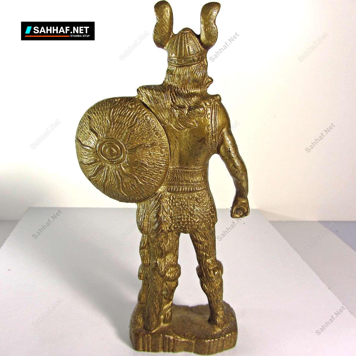 Metal ve içi dolu Viking savaşçı figürü. Yabancı kökenli bir ürün, sarı renkli fakat pirinç olmayabilir, belki de kurşun veya kurşun alaşımı çünkü ağırlığı 2 kg kadar var. Yükseklik: 22,5 cm
