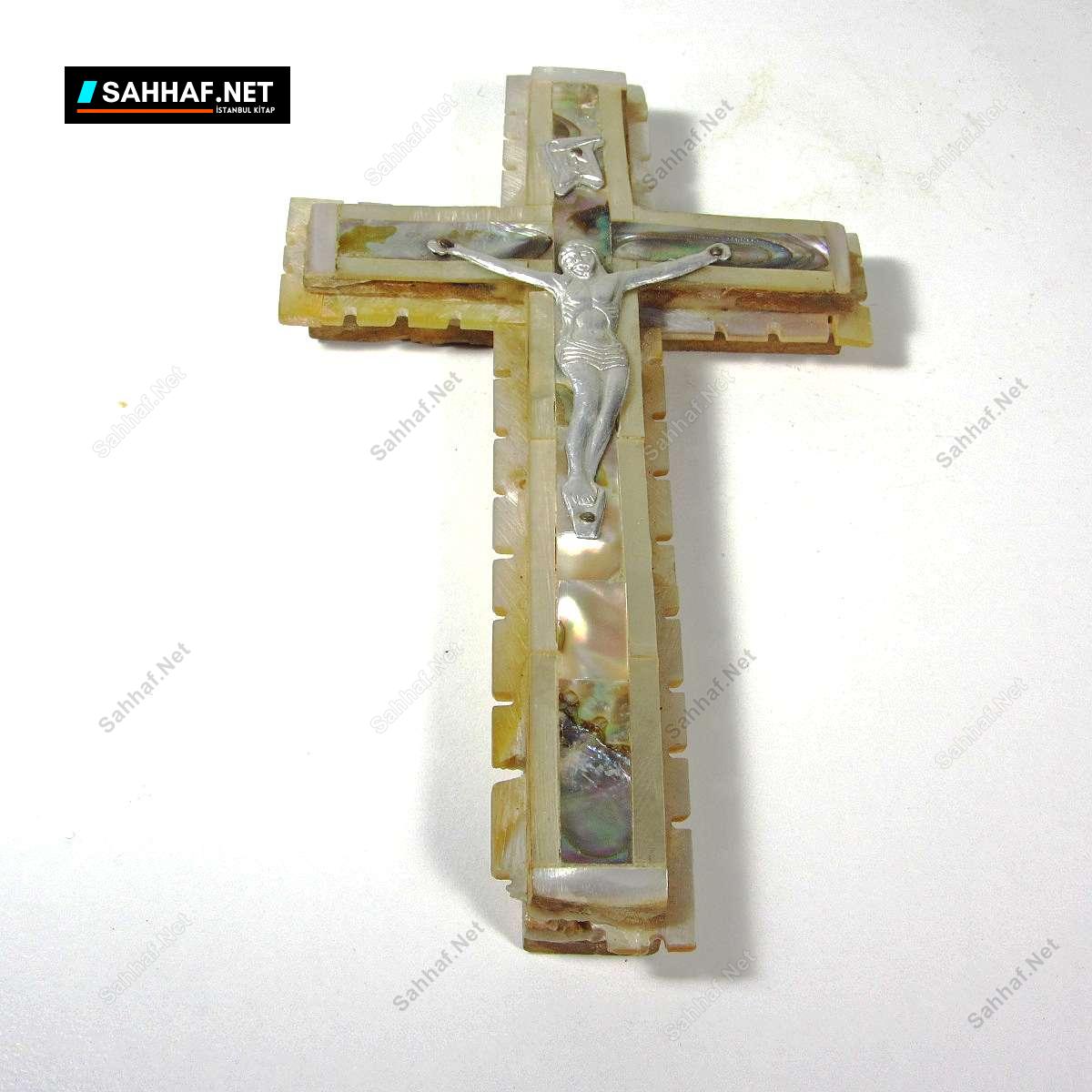 Jerusalem yapımı (arkası damgalı) sedefli haç ve üzerinde aluminyumdan yapılmış İsa figürüyle beraber haç. Sol alt köşesinde maalesef 1 cm kadar kırığı var. Arka kısmında asma halkası mevcut. Sedefin alt kısmında ahşap kaideye sahip, 2 tabaka sedef ve 2 tabaka ahşap olmak üzere 4 katman kullanılarak yapılmış. Boy: 12 cm
