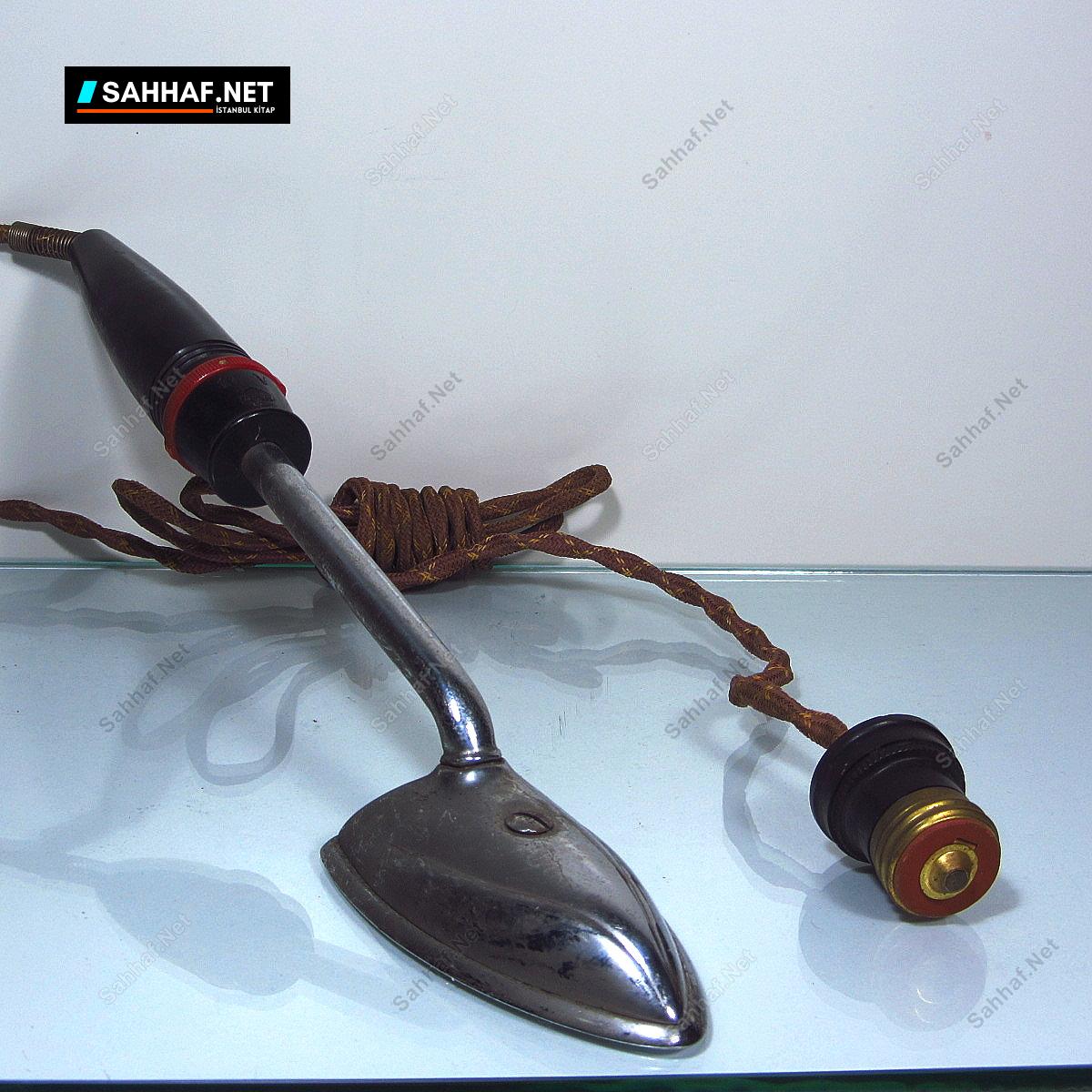 Çok ilginç formda bir ütü. Seyahat ütüsü mü, yoksa kravat, mendil gibi spesifik işler için mi yapılmış bilemiyorum. Amerikan olması lazım 100 Volt yazıyor üzerinde. Fiş sistemi de çok ilginç, lamba yuvasına takılacak şekilde bir uca sahip. Priz olmayan yerlerde bile kullanılabilir. Tabii Türkiye’de çalışmayacağını söylemeye gerek yok sanırım, voltaj farkından dolayı. Muhtemelen 1950 civarı bir ürün, Sapla metal kısım uzunluk: 32 cm