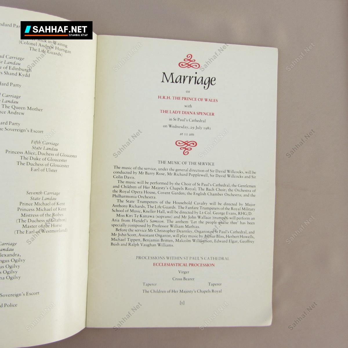 Prenses Diana ve Prens Charles düğün programı. 1981 yılındaki düğünün orijinal program kitapçığıdır. Yüzyılın düğününden güzel bir hatıra.