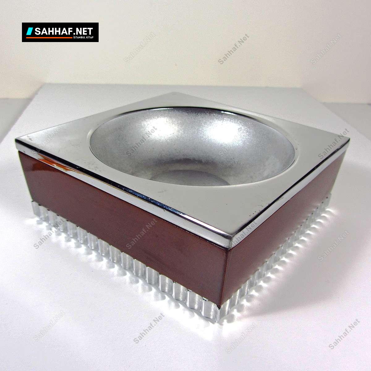 İlginç bir tasarıma sahip estetik görünümlü bir masa kül tablası. Modern bir havası var, üzerinde sigara koyma standı yapılmamış, bu sadeliğini arttıran bir tarz getirmiş. İçi metal, kubbe gibi olan iç kısmı ma diğer kısımlar parlak olarak yapılmış. Yan kısımların iç tarafı ahşap (içeriden gözüküyor) dış kısmı ise bakalit tarzında bir malzemeyle kaplanmış gibi, vernik desem değil; çünkü vernikten çok daha parlak bir yüzeyi var. Üst kısım alt kısma vidalarla monte edilmiş, birbirini tutmasını sağlıyor. Vidalardan biri eksik, uyacak bir vida bulunabilir. Ölçü: 13x13x5 cm