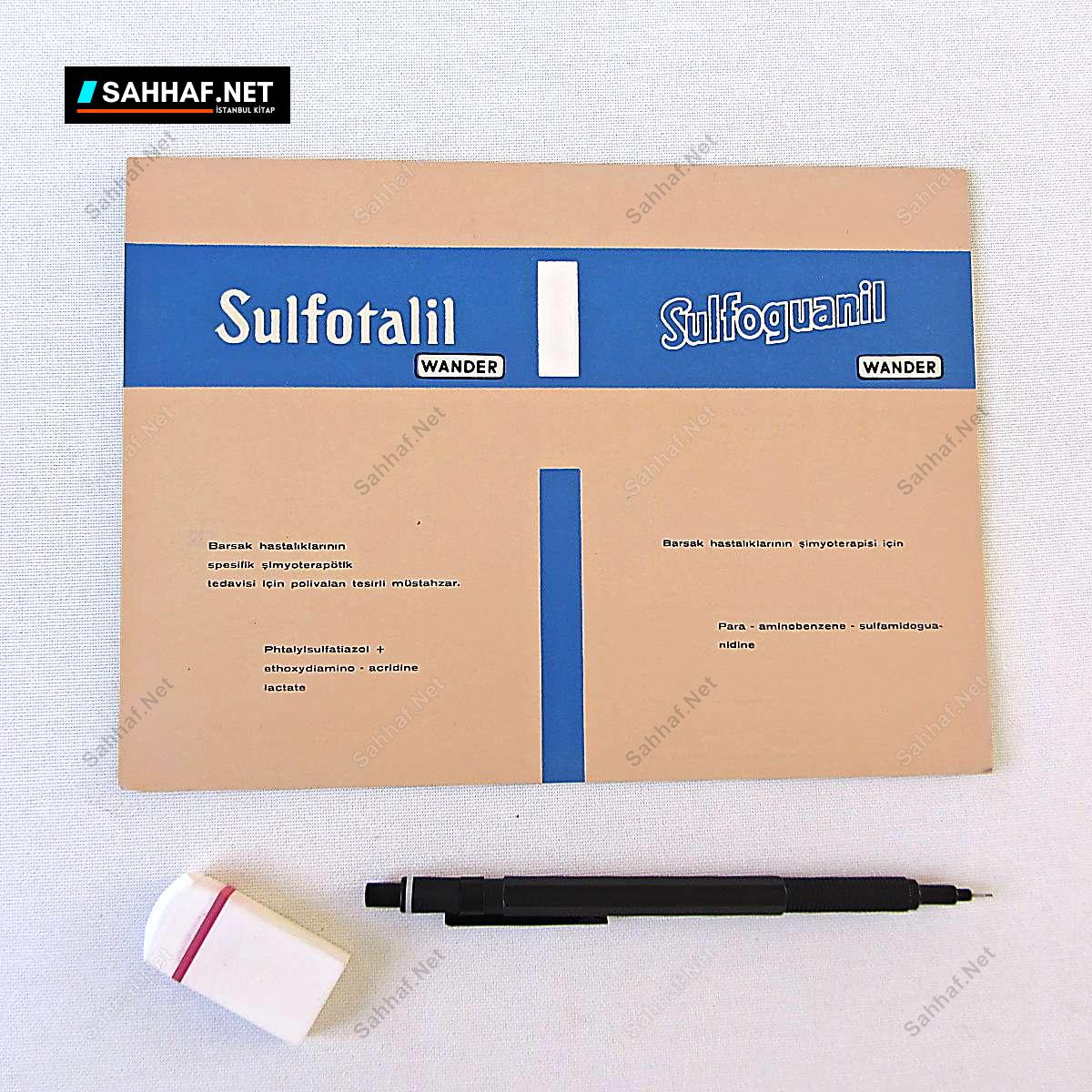 Wander ilaç firması SULFOTALİL ve SULFOGUANİL ilaç tanıtım broşürü. Postadan geçmiş, üzerinde 10 kuruşluk damga var.Karton, 1950 veya 60’lar.