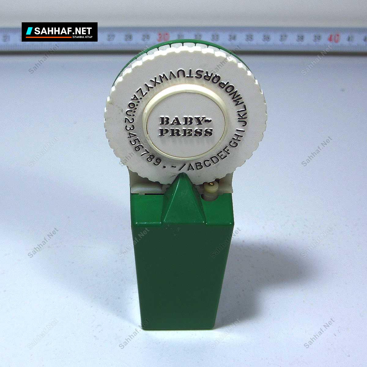 Baby Press marka yeşil renkte plastik yazı yazma makinası. 1980’ler. Şeridi bulunuyorsa hala iş görüyor.